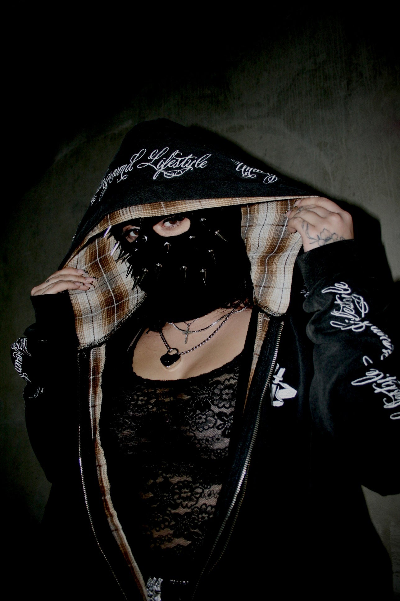Two functioning hoods and two functioning zippers giving you unlimited ways to style/wear! Pairing a stonewashed black outer with a brown/beige flannel inner on the hood and along the double zipper and bottom hems. Embroidery detail “Underground Lifestyle” along the outer hood and along outer sleeves in our “cursive” font.